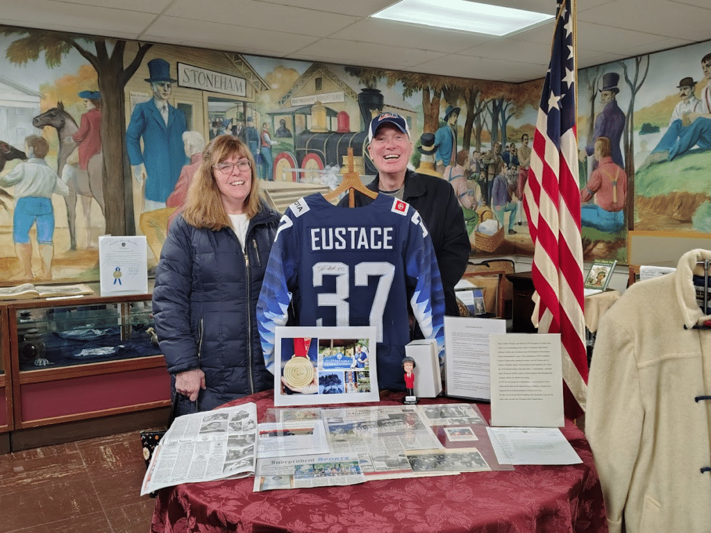 David’s proud parents, Andrea and Paul Eustace, joined us at the museum in February Open House before they left to watch the Paralympics at Cortina, Italy. They can be seen below posing with one of our prized artifacts – a signed jersey from David’s first trip to the Olympics in Beijing in 2022. It was part of our Olympics exhibit featuring artifacts from Stoneham’s seven other Olympic athletes. They have all made their hometown proud.